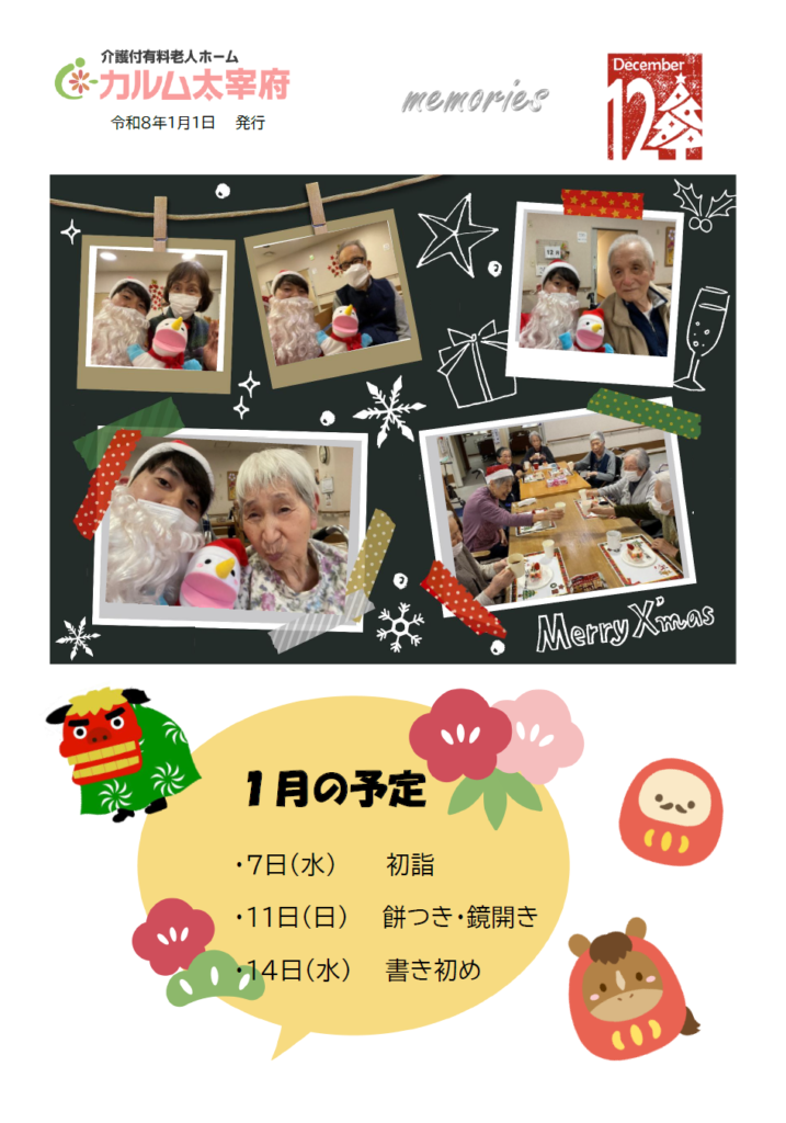 今年も、ご利用者の皆さまやご家族の一助となれるよう努めてまいります。本年もどうぞカルム太宰府をよろしくお願い申し上げます。