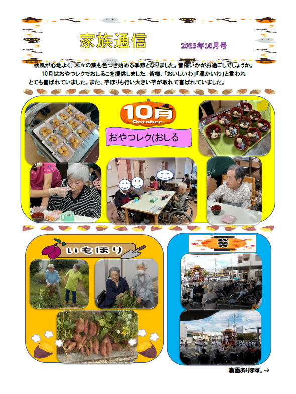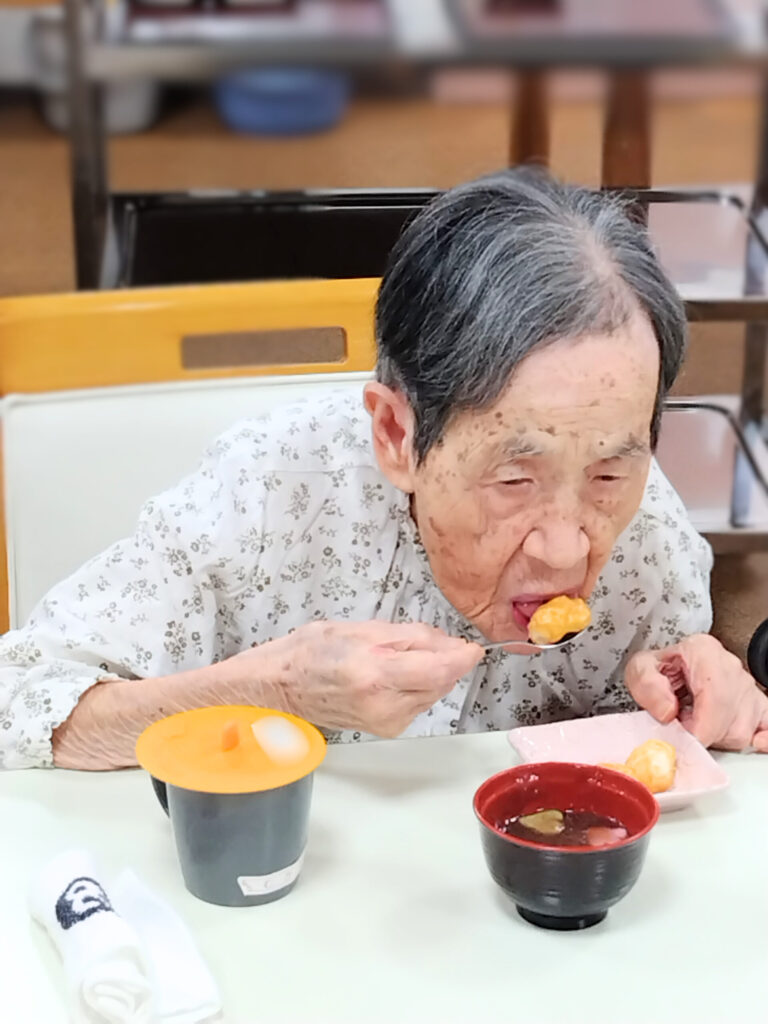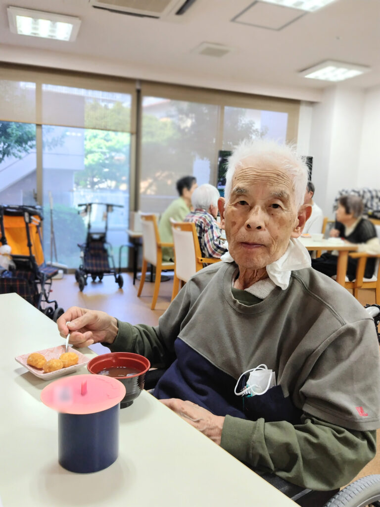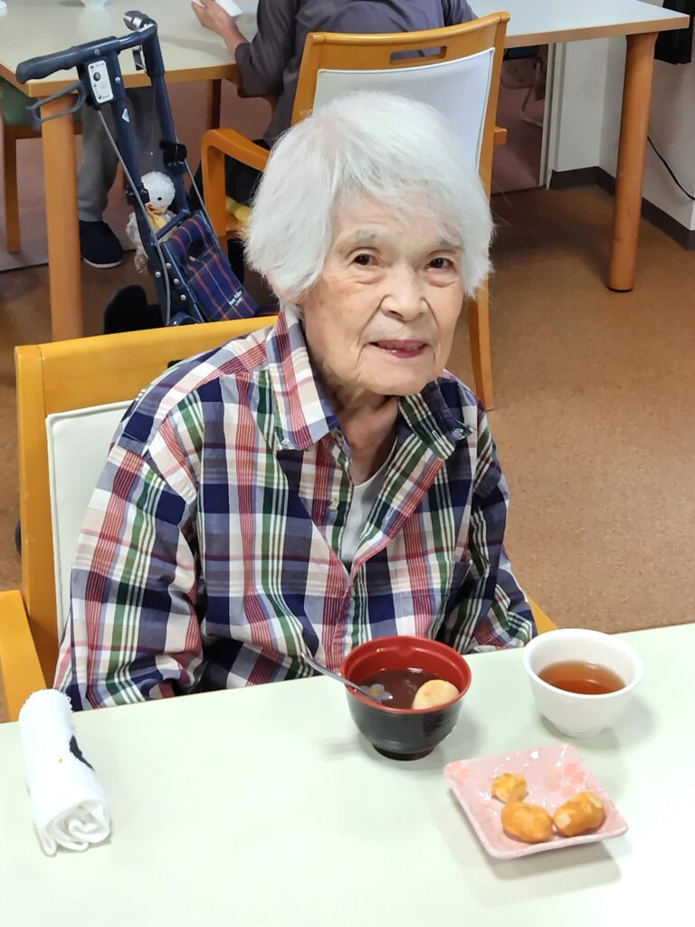 10月はおやつレクで「おしるこ」を味わい、皆さまの笑顔が広がるひとときに。