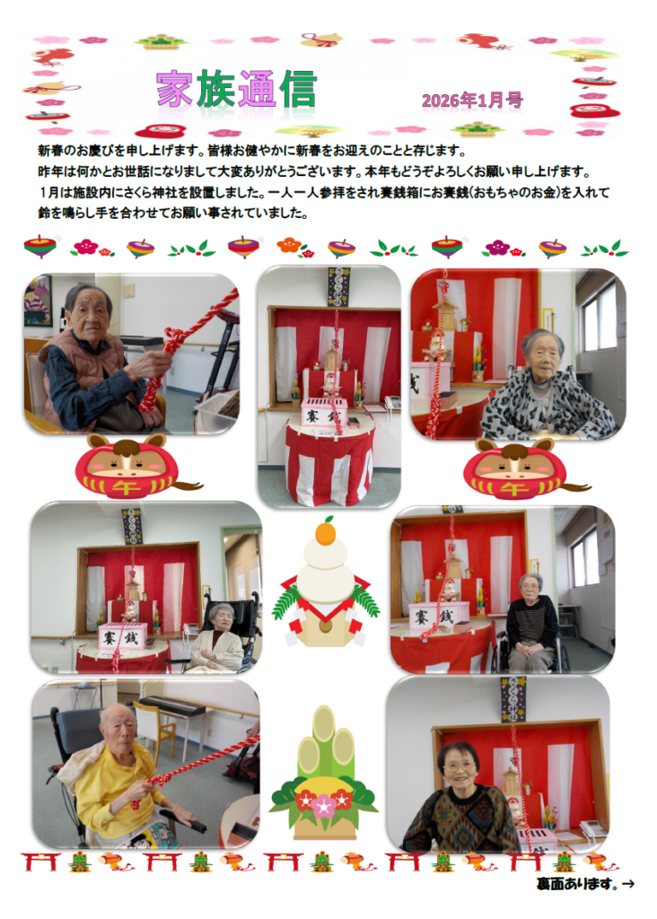 お正月、当施設では館内に「さくら神社」を設置し、 入居者様に初詣を楽しんでいただきました。 職員が付き添いながら車椅子の方も、歩行器の方も、皆さまご自身のペー…