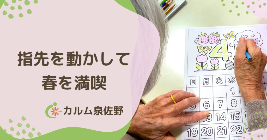 春を感じる4月のカレンダー塗り絵レクリエーション カルム泉佐野では、先日レクリエーションの一環として、4月のカレンダー塗り絵を行いました。春らしい絵柄で、桜やチューリップ、蝶などが描かれた塗り絵は、季節の訪れを感じさせるデザインです。 入居... -