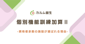カルム皆生では、2025年7月より「個別機能訓練加算Ⅱ」を算定しております。今回は、その内容や目的についてわかりやすくご紹介いたします。 個別機能訓練加算とは? 「…