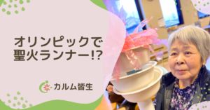 今年はオリンピックイヤーということで、カルム皆生でも入居者様に“聖火ランナー”になっていただくレクリエーションを行いました。