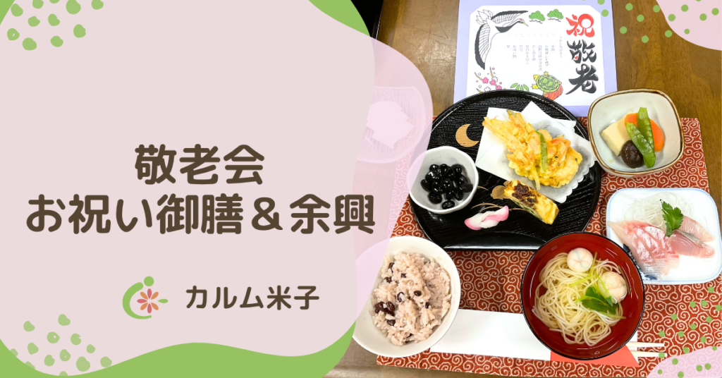 秋の気配が感じられる今日この頃、カルム米子では小規模多機能とグループホーム合同で毎年恒例の「敬老会」を開催いたしました。 今年も、利用者様への感謝の気持ちを込めて、職員一同心を込めて準備を進めてまいりました。 昼食には、職員手作りの敬老の... -
