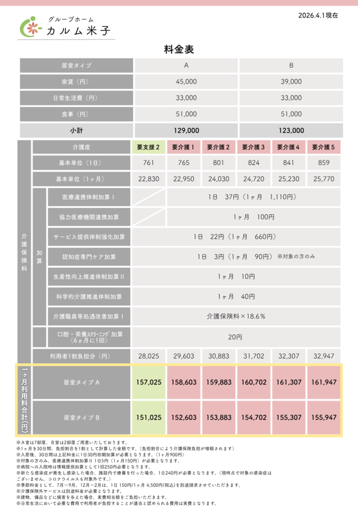 カルム米子 グループホーム料金表2026.4.1~