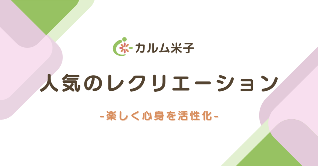 レクリエーションで心と体に元気を|当事業所の取り組み レクリエーションは、利用者の心と体を動かし、生活に張り合いを生み出す大切な時間です。カルム米子では、集団で楽しむレクリエーションから、個々の興味や状態に合わせた個別レクまで、幅広い取り... 未分類